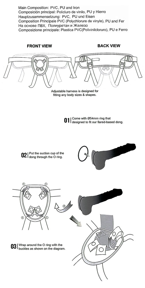 Przezroczyste penis dildo z jądrami i stopką ssącą, które można przymocować do pierścienia za pomocą regulowanego czarnego paska (obwód 60-157 cm).