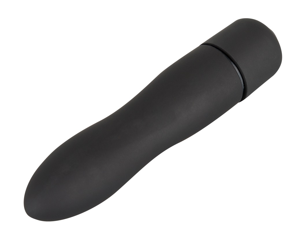 Matowy czarny mini wibrator. Około 8 cm długości, Ø 1,7 cm. Materiał: ABS z powłoką PU. Baterie w zestawie.