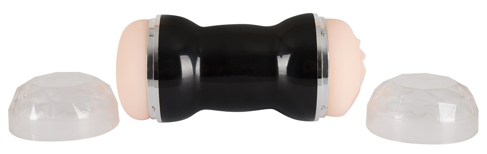 Podwójny masturbator w kolorze skóry w czarnej i srebrnej obudowie. Strukturalny kanał przyjemności jest otwarty po obu stronach - z jednej strony w formie pochwy, z drugiej strony w formie odbytu. Długość całkowita 20 cm, średnica wewnętrzna ok. 4 cm. Zalecany jest środek smarny do stosowania. Kanał przyjemności może być wyciągnięty z puszki w celu wyczyszczenia. Materiał: TPR, pokrywa ABS.