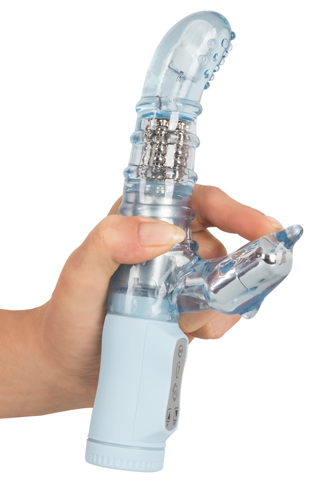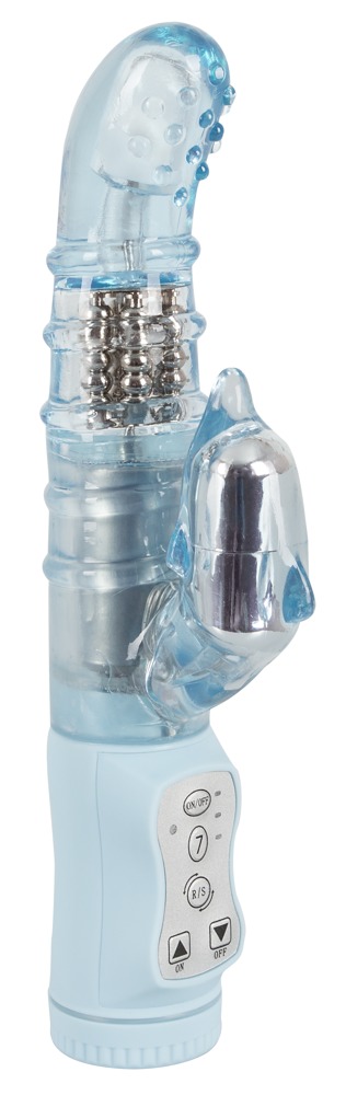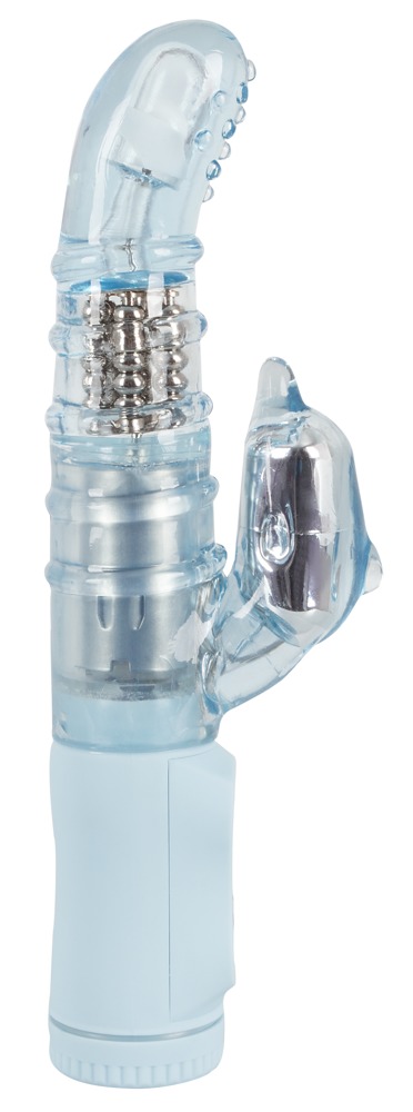 Jego anatomicznie idealnie zakrzywiona, obracająca się końcówka pryszcza specjalnie stymuluje Twój punkt G. A obracające się metalowe kulki w wale orgazmicznie masują kanał miłosny, podczas gdy silnie wibrujący stymulator delfinów stymuluje Twój przycisk przyjemności. Jasnoniebieski. Długość całkowita 21 cm, Ø 3 cm. Wibracje w 7 stopniach, obrót w prawo/lewo po 3 stopnie, sterowane za pomocą jednego przycisku. Materiał przyjazny dla ciała: TPE, ABS. (Prosimy zamawiać oddzielnie baterie: 3 x Micro).