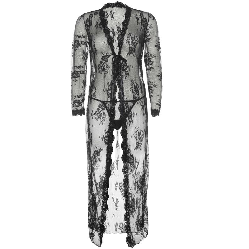 Długi szlafrok z koronką z falistym wykończeniem, satynową tasiemką i dopasowanymi stringami, renomowanej marki bielizny Leg Avenue.