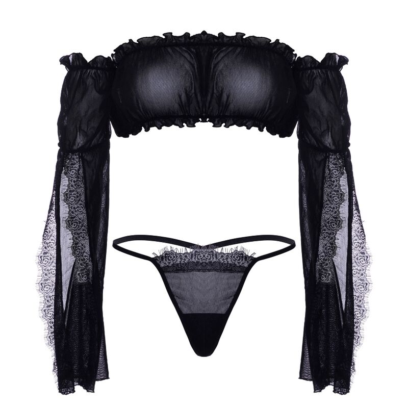 Top z siateczki z koronkowymi rzęsami wykończonymi rozkloszowanymi rękawami i stringami, renomowanej marki bielizny Leg Avenue.