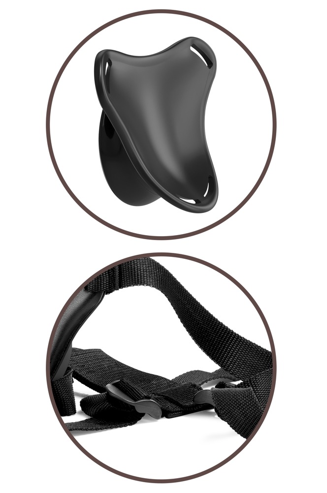 Prosty system strap-on oparty jest na anatomicznie zakrzywionej płytce ciała z wgłębieniem dokującym, w którym każda stopka ssąca dildo lub wibratora (nie dołączona) jest zamocowana/dokowana bombowo i utrzymuje dildo/wibrator w pozycji pchającej (Push & Play). Płyta korpusu równomiernie rozkłada nacisk na obszar miednicy, dzięki czemu unika się punktowego, niekomfortowego ucisku. Wytrzymałe, szerokie ramiączka można regulować za pomocą plastikowych suwaków, co zapewnia pewne i wygodne dopasowanie.
