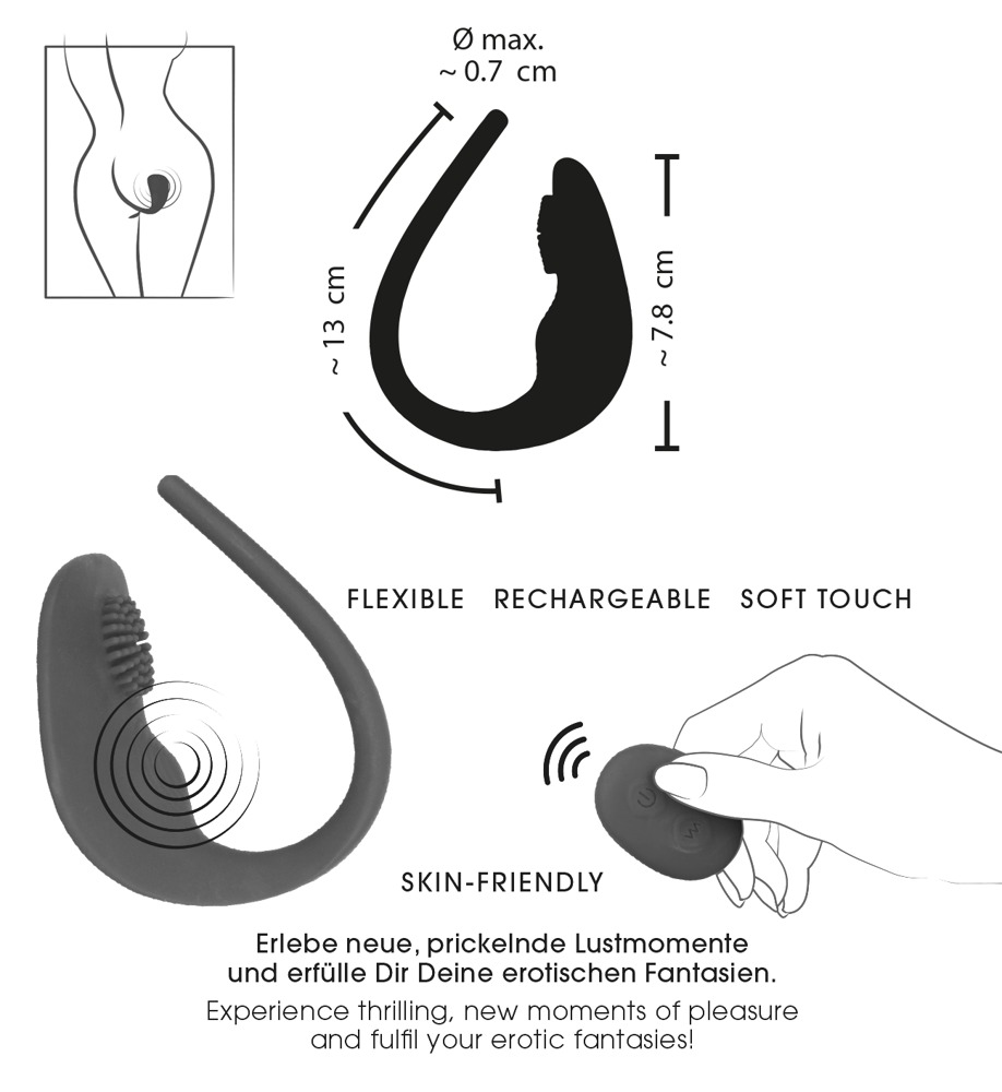 7 cichych trybów wibracji może być wygodnie sterowanych za pomocą pilota - nawet przez Twojego partnera. Wibracje są optymalnie rozłożone na wypustki stymulujące łechtaczkę, wyraźnie wyżłobiony brzeg sromu i wąski stymulator odbytu/perineum, co zapewnia wszechstronną rozkosz.