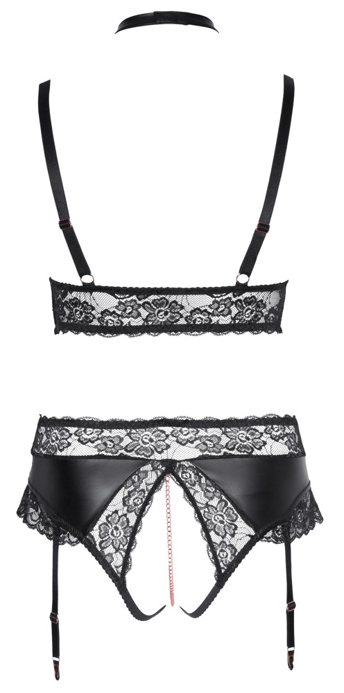 Miękki biustonosz i figi ouvert Cottelli CURVES w połączeniu matowego wyglądu z miękką, elastyczną koronką i elementami w kolorze różowego złota. Biustonosz wyróżnia się łańcuszkami do dekoltu, które można odpinać od ramiączka (zapięcie na rzep) i od biustonosza. Majtki są ponętnie otwarte w kroku aż do samej pupy i posiadają stymulujący łańcuszek w kroku. Regulowane szelki są wyjmowane z majtek.