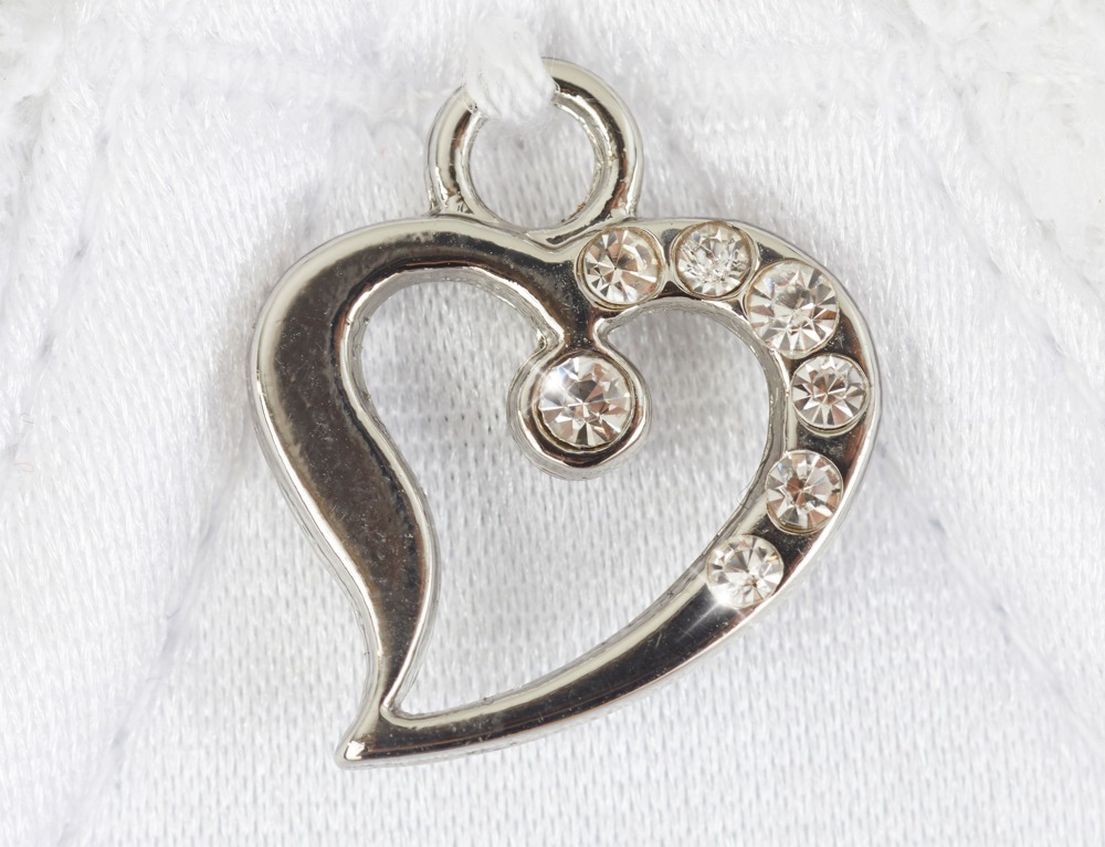 Pas podnoszący i pas do pończoch wykonane z elastycznej satyny z koronkową wstawką, stringi w całości wykonane z koronki. Podwyższenie na fiszbinach z sercem z dżetów pomiędzy lekko wyściełanymi miseczkami i zapięciem na haftki z tyłu. Pasek do pończoch z ozdobnym sznurowaniem i zapięciem na haftkę z tyłu. Paski i szelki regulowane. Stringi uwodzicielsko bez krocza.