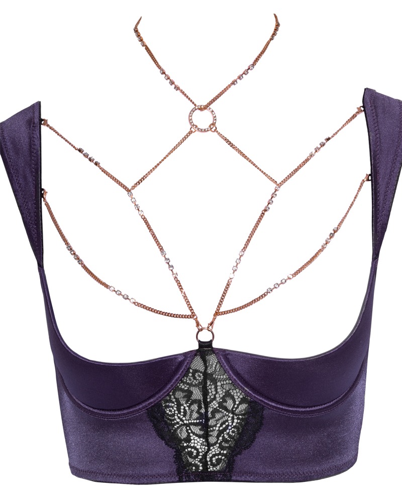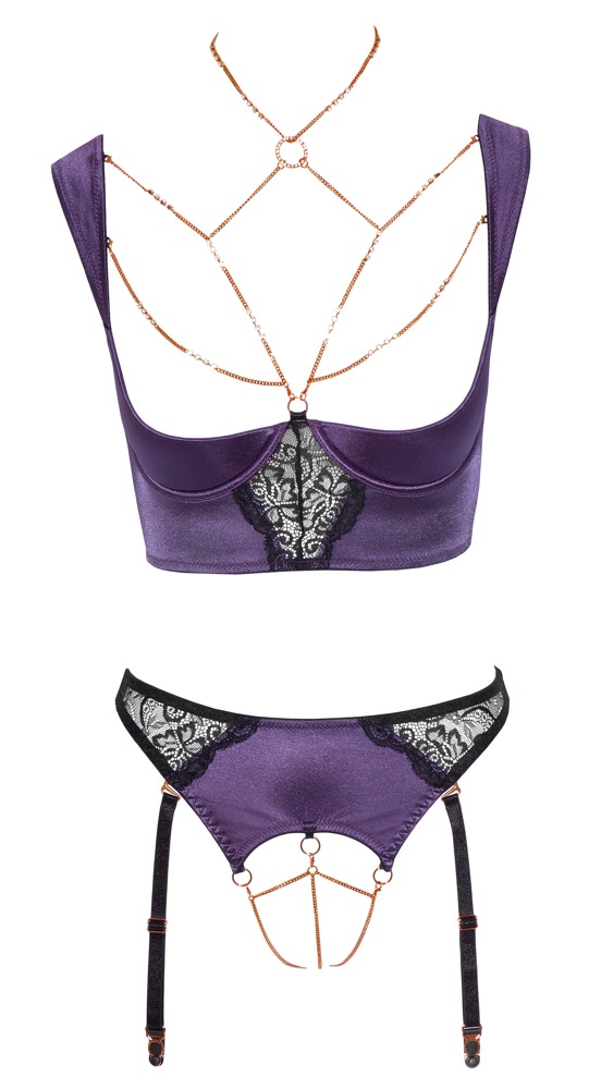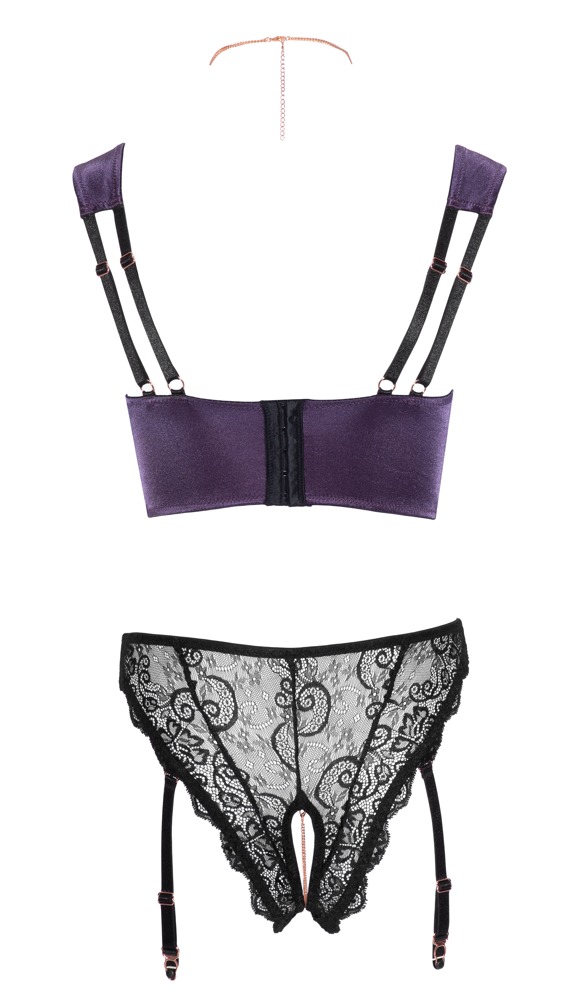 Podnoszone i odkryte figi Abierta Fina wykonane z elastycznej, fioletowej satyny z wstawkami z delikatnej, czarnej koronki, ozdobione łańcuszkami z dżetów w kolorze różowego złota. Podwyższona fiszbina z lekko usztywnianymi miseczkami sprawia, że biust zyskuje wysoką formę i znajduje się bezpośrednio w polu widzenia. Łańcuszki i naszyjnik są odpinane od biustonosza. Szerokie ramiączka z tyłu są regulowane i mają 4-krotną długość. Majtki na szelkach wykonane są z mieszanki materiałów z przodu i całkowicie z koronki z tyłu. Trzy stymulujące łańcuszki w kroku prowadzą przez zachęcająco otwarte krocze, które również można odpiąć, podobnie jak regulowane szelki.